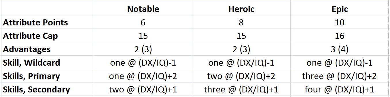 As mentioned in the original article, the system can easily be modified by changing the underlying assumptions. It’s great as written for creating PCs of a certain power level, let’s call it “Notable,” but the math is too restrictive for emulating characters of higher point values.